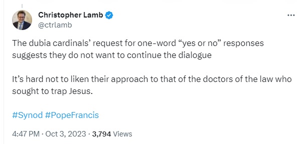 Christopher Lamb, Rom-korrespondent för brittiska The Tablet, skrev på f.d. Twitter att man inte kan låta bli att associera de fem kardinalernas krav på strikta ja- eller -nej-svar till de laglärda som försökte snärja Jesus: