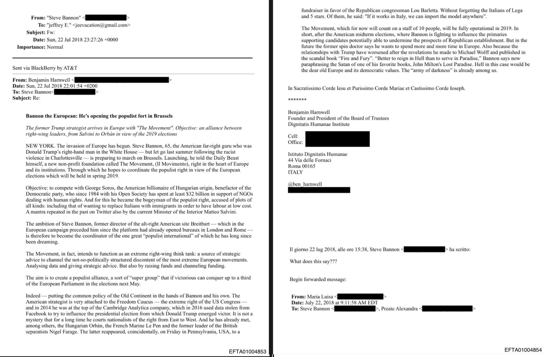 Bannon, själv katolik förankrad i traditionalism hade nära kontakt med kardinal Burke och Benjamin Harnwell, grundare och chef för det konservativa institutet Dignitatis Humanae. Harnwell bekräftade för nyhetsbyrån Reuters att Bannon i flera års tid aktivt har deltagit i uppbyggandet av institutet. Kardinal Raymond Burke, som då hörde till institutets rådgivande grupp, sade att Bannon kommer att få en ledande roll. Nu får vi genom Epsteinfilerna mer inblick i detta. Här ett dokument där Bannon berättar om planerna för JE: